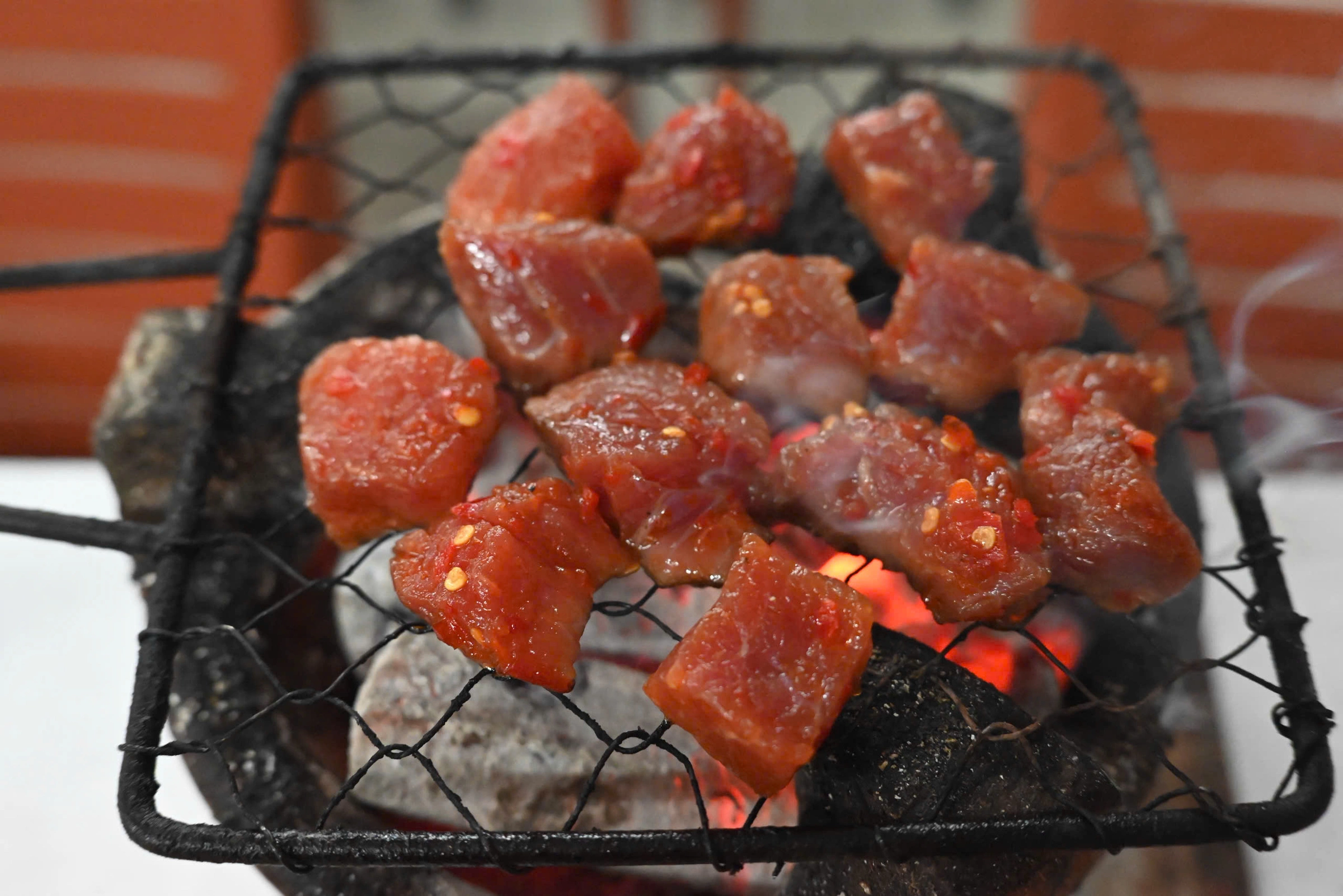 Điểm đặc biệt của quán nằm ở món bò nướng. Thịt bò được ướp mật ong cùng hơn 10 loại gia vị theo công thức gia truyền, sau đó xắt thành từng miếng vuông khoảng 2 cm. Thực khách tự nướng trên bếp than hồng, thịt chín vừa tới, mềm và đậm vị. Món ăn kèm rau sống, bánh mì, chấm muối chanh ớt hoặc chao đỏ.