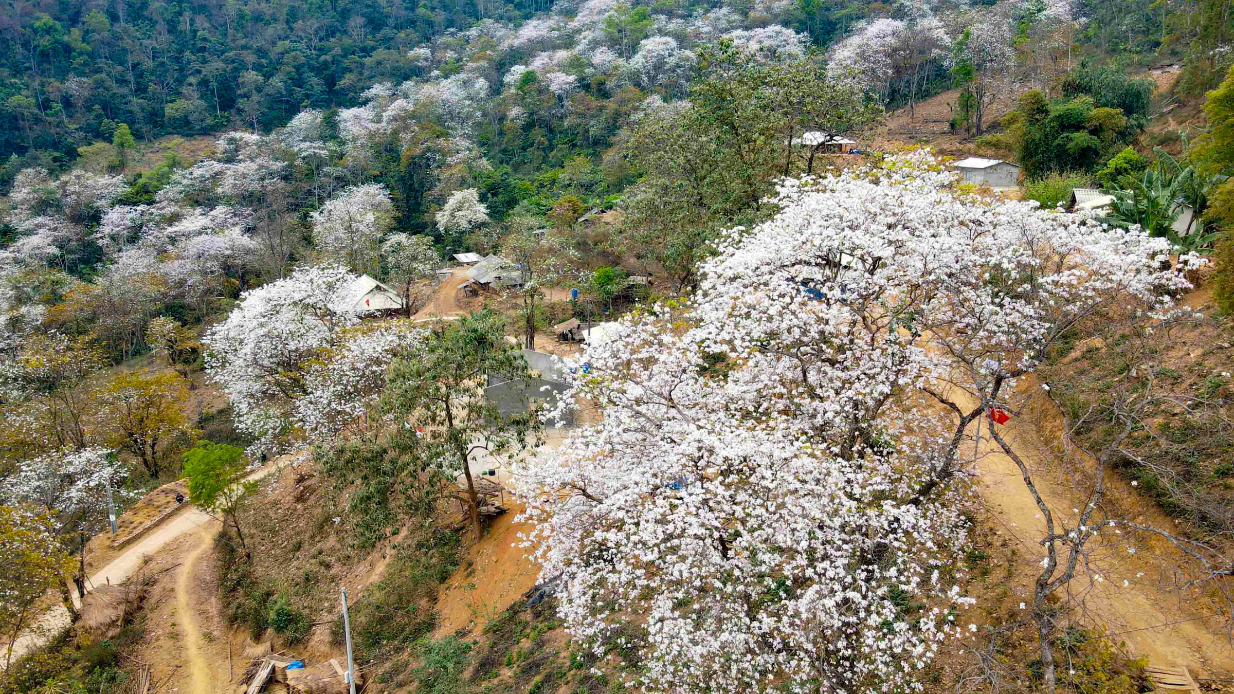 Tháng 3 hằng năm, hoa ban bung nở khắp núi rừng, bản làng và phố phường ở Điện Biên. Dọc theo các cung đường dẫn vào trung tâm Điện Biên Phủ và các huyện vùng cao, sắc trắng của hoa ban phủ kín các triền núi. Bản Nặm Cứm, xã Nà Tấu (ảnh) chìm trong sắc hoa ban.