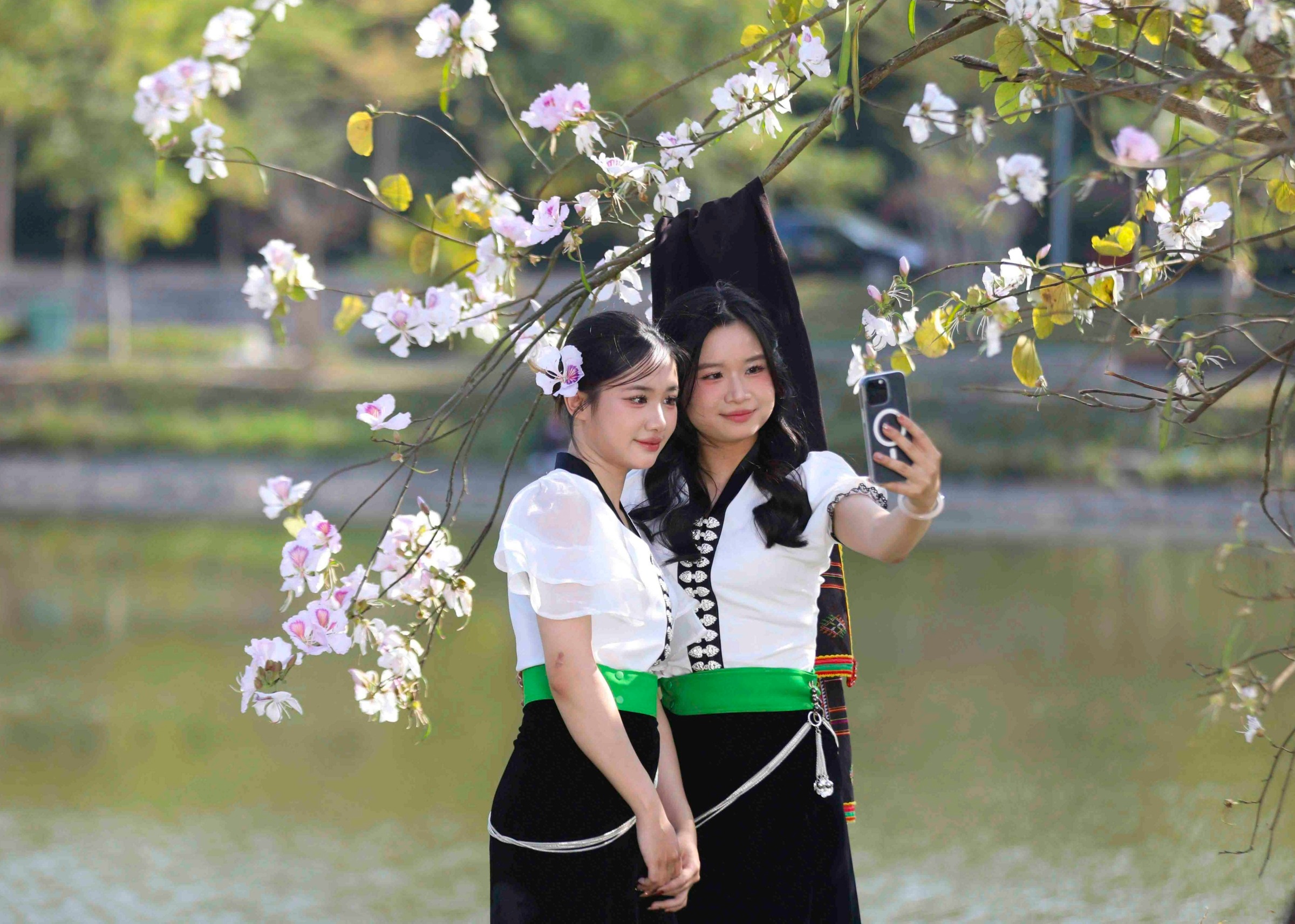 Thiếu nữ trong trang phục dân tộc Thái lưu giữ khoảnh khắc với mùa hoa ban. Anh Xuân Tư cho biết các tuyến đường, khu vực ven hồ và công viên có hoa ban nở rộ thu hút người dân và du khách dừng chân chụp ảnh, tận hưởng không khí mùa xuân.