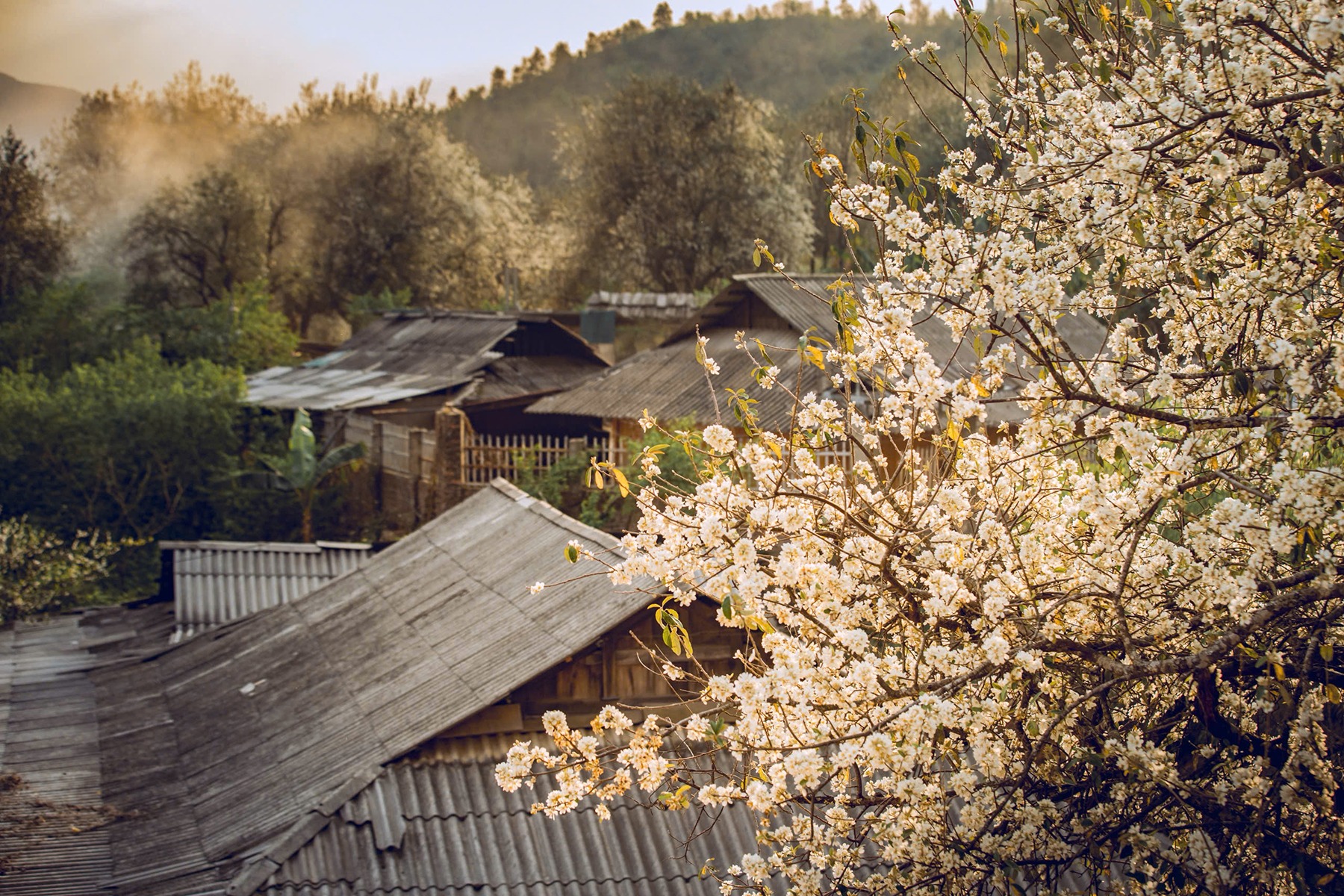 Mùa hoa sơn tra bung nở, phủ trắng bản Nậm Nghiệp, xã Ngọc Chiến những ngày đầu tháng 3, trở thành điểm đến hấp dẫn cho du khách chụp ảnh, trải nghiệm văn hoá bản địa.