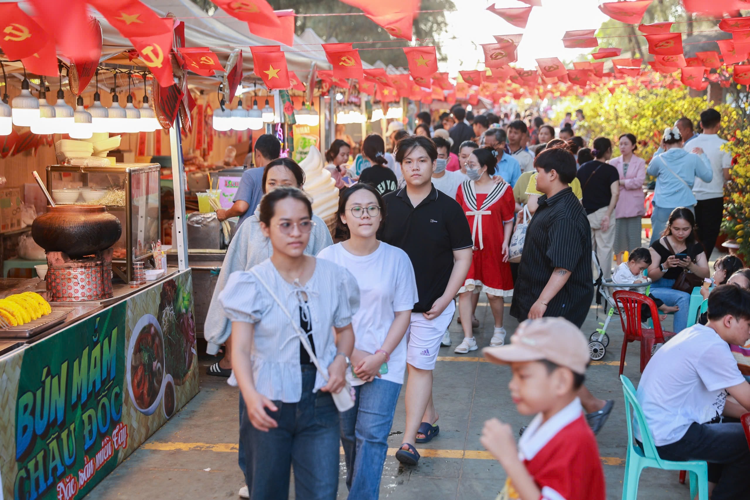 Sau một vòng chụp hình, ngắm cảnh, vui chơi, du khách có thể nạp năng lượng tại khu gian hàng ẩm thực ba miền, với đầy đủ các món đặc trưng ngày Tết như mứt, bánh kẹo, bánh tét, đến các món ăn mang tính địa phương bún nước lèo, bún mắm, bánh miền Tây…