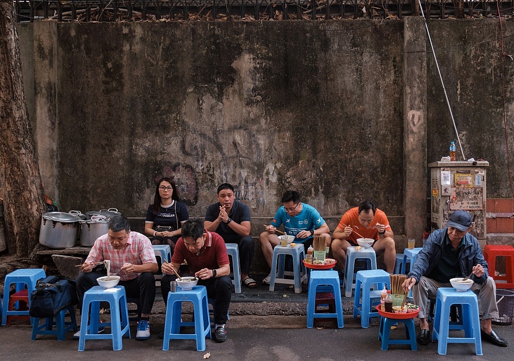 Khi bóng tối len vào từng ngõ nhỏ, các tiểu thương bắt đầu thu dọn hàng. Hoạt động buôn bán trong ngày kết thúc, nhưng nhịp sống phố cổ không dừng lại. Thay vào đó, những nồi nước dùng lớn bốc khói xuất hiện trên vỉa hè. Thực khách ngồi trên những chiếc ghế đẩu, chờ đến lượt được phục vụ.