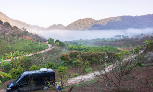 Bốn du khách Hà Nội khởi hành từ 19h ngày 12/1, có mặt tại Mộc Châu vào 24h cùng ngày. Điểm đến là vườn mơ Thái Hưng, nằm cách thác Dải Yếm khoảng 2 km. Đây là một trong hai vườn mơ lớn nhất vùng, có hàng trăm cây nở cùng lúc. Anh Chiêm chọn vườn này vì được một người bạn ở Mộc Châu giới thiệu. Đường rộng, ôtô có thể vào tận vườn.