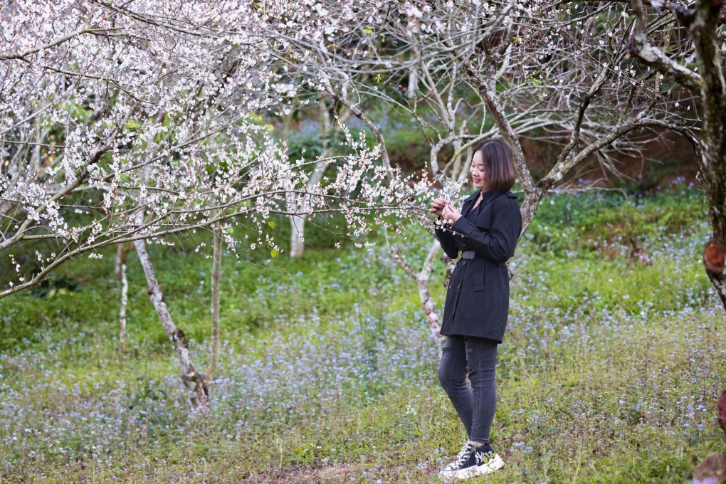Chị Quỳnh chụp ảnh tại vườn mơ ở Mộc Châu.