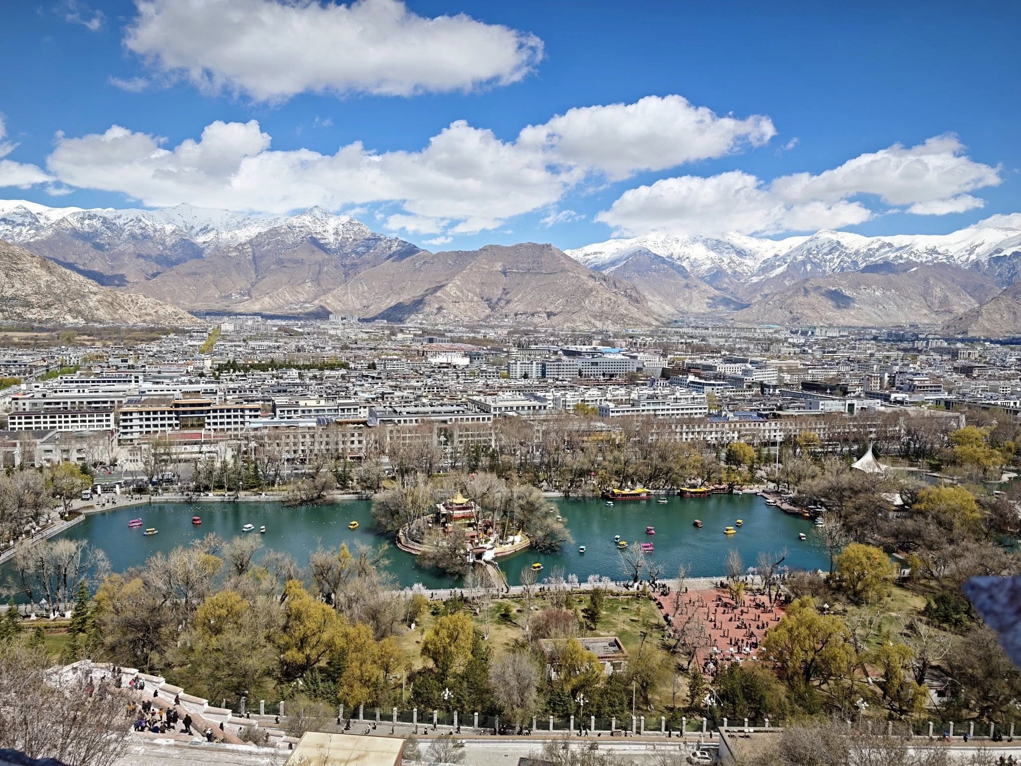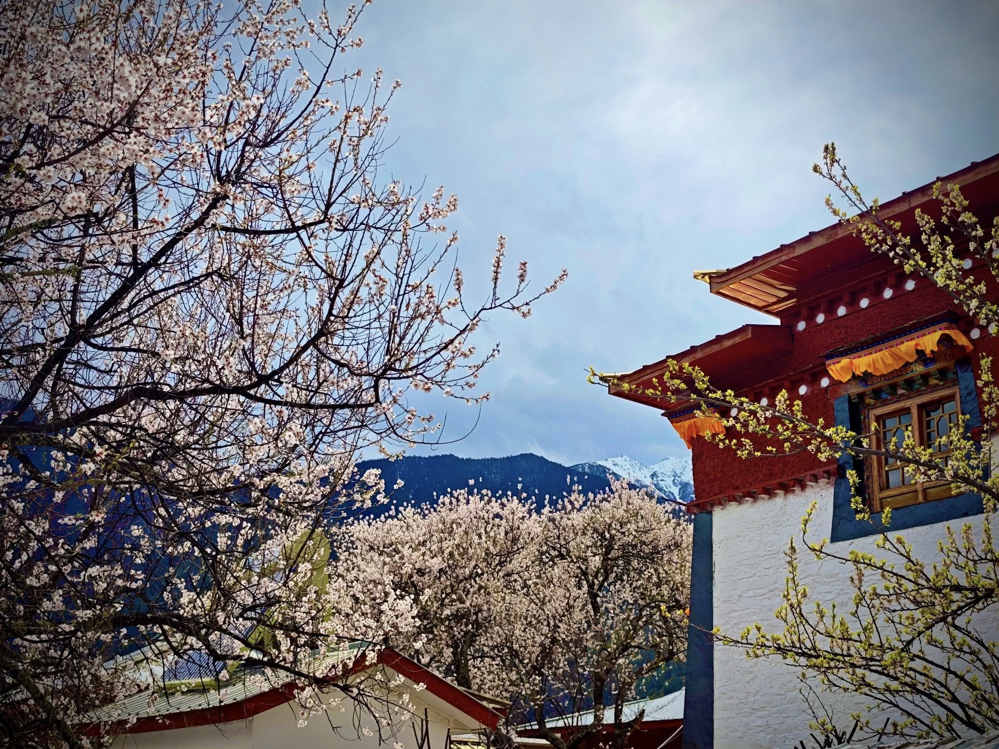 Tây Tạng đang là mùa xuân, nhiều loài hoa nở bung nở khắp nơi như anh đào, mơ, cải, trong đó, hoa anh đào nhiều và nổi bật nhất.