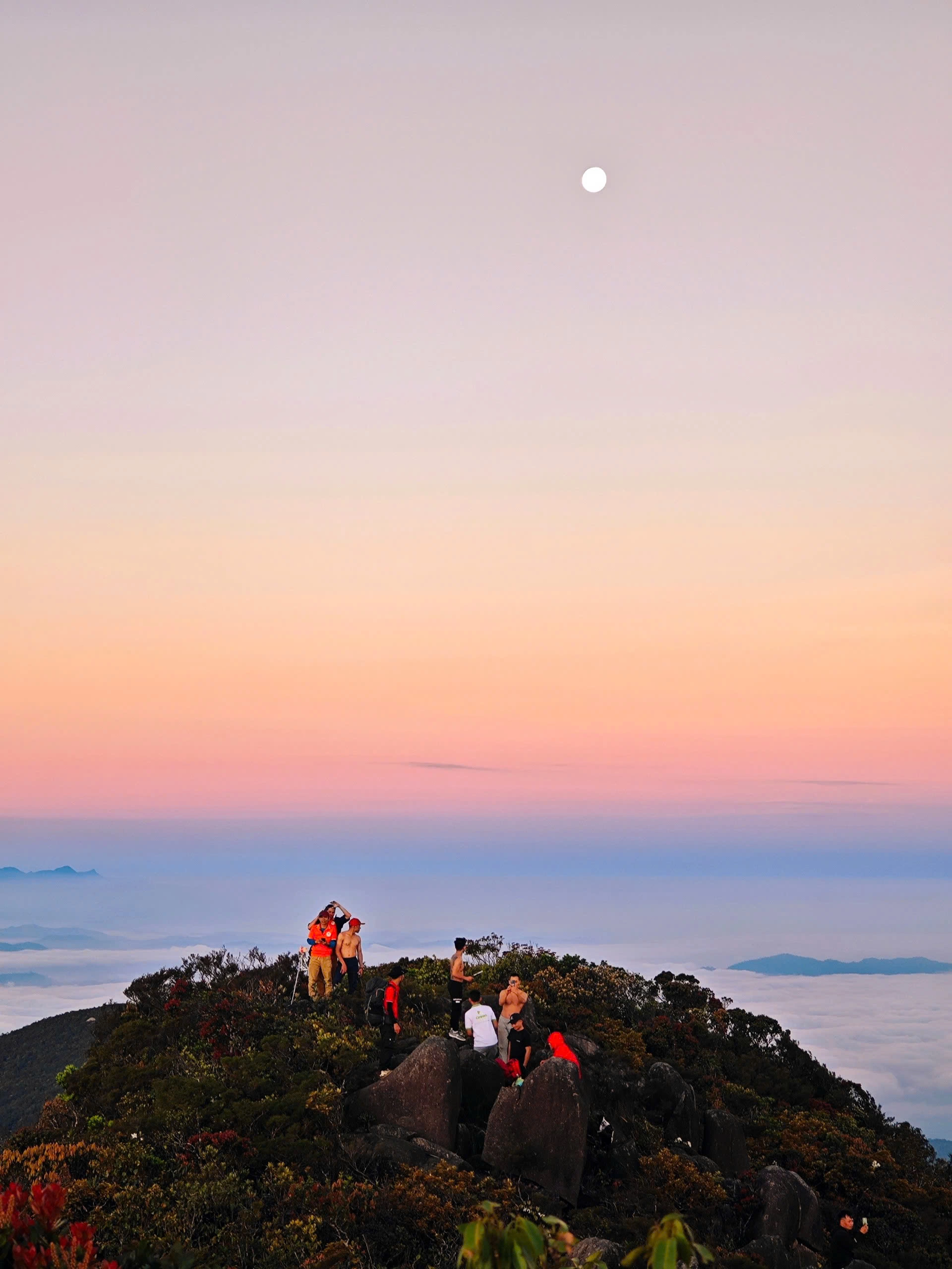 Sau khoảng 5 tiếng, anh Nguyên lên đến đỉnh núi. Do trời tối, nam du khách chọn cắm trại một góc rừng, nhóm lửa sưởi ấm, chờ bình minh lên để “săn mây”. Tại đây, một đoàn người khác cũng đang cắm trại, “chờ đón khoảnh khắc đẹp nhất khi lên đỉnh núi”.